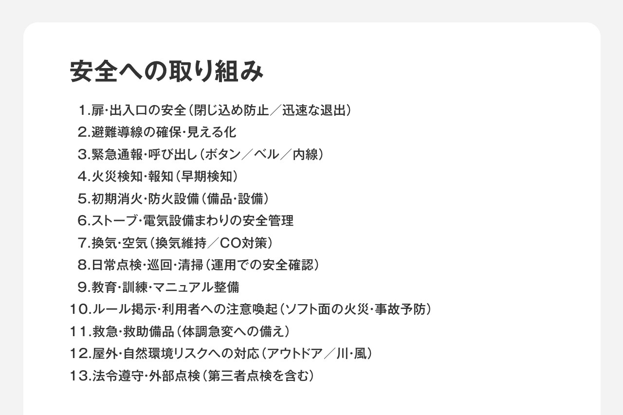 そのため、個々の取り組みについて正否や優劣を判断・評価することは行っておらず、施設さまから共有いただいた内容をもとに、「他の施設ではどのような安全対策が行われているのか」を把握するための情報整理としてまとめています。
