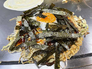 ちょいパリ麺系の広島風お好み焼き。 店内が広くて良い。どこ座っても鉄板で食べられる。