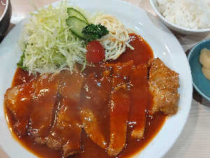 油の膜でスープが激熱。美味すぎたけど高血圧のため完飲せず。 ポークチャップも有名。