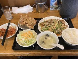 入浴前の腹拵え。 ランチタイムで白飯おかわり自由、嬉しい拳サイズ唐揚げ付き。