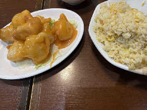 正確なメニュー名不詳だが、肉野菜炒めと麻婆豆腐のセット。ピリ辛。