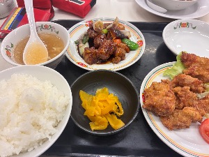 唐揚げ、麻婆豆腐、酢豚の3品を一度にいただけます。