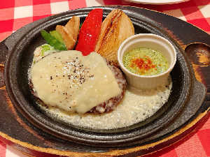 神田グリル特製チーズハンバーグ じゃが芋のクリームソース〜彩り野菜のバジルクリームソース添え〜