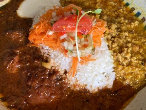 ちきん(ママ)とポークダルキーマを選択。あっさりとコク深のカレーを一度に楽しめて満足満腹。美味し。