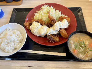 今年の「秋の海鮮フライ定食」は牡蠣フライ2個と海老フライ、さばフライ、鶏のから揚げが各1個づつ