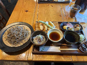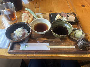 天ぷら5種 太刀魚の小丼 もりそば 付け合わせ ゼリーがついて¥1300は大満足