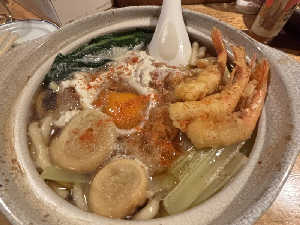 宴会の〆に鍋焼きうどん 海老天追加し載せてみた笑 美味い!