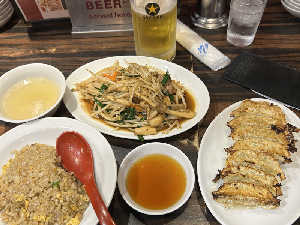 餃子は安定の美味しさ、焼飯はべちゃべちゃでイマイチ、サッポロ黒ラベルは美味しい