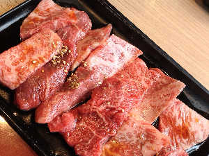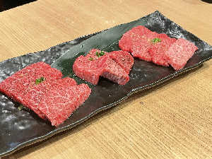 小川畜産直営店の炭火焼肉。本日のおすすめ赤身肉カメノコ、シンシン、トモサンカクの3種盛り合わせ♪