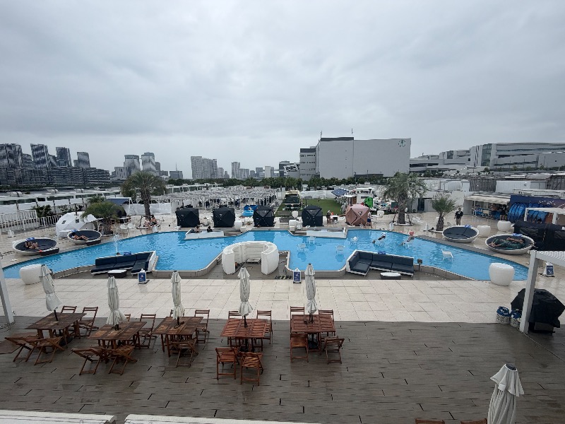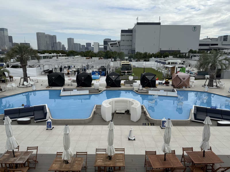 水風呂は10センチくらいの見た目だけプール以外に水風呂プール2.チラーなく水温高めだけどこの時期は心地よい。あとシャワ。椅子はインフィニティこそないけどすごい数ある。