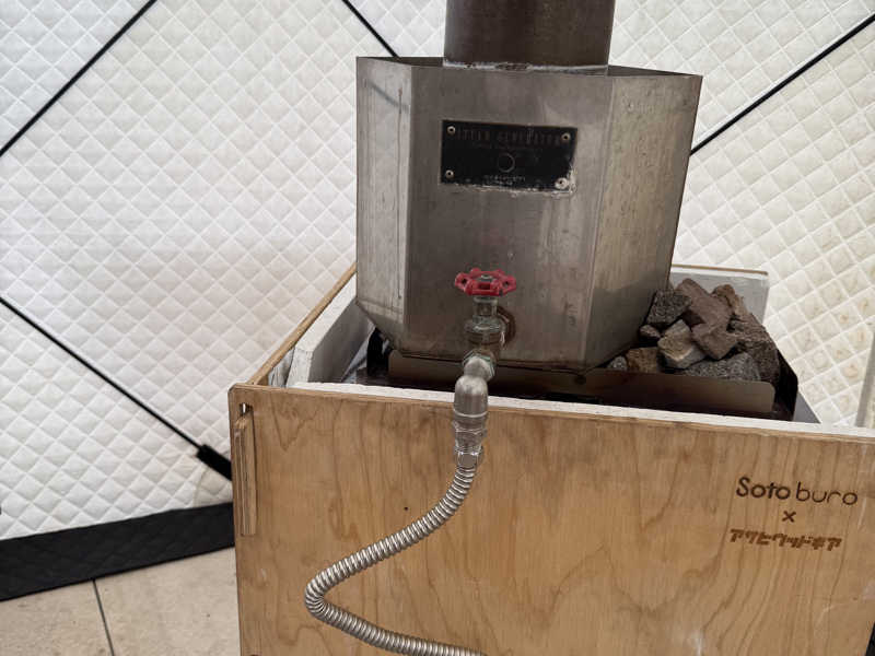 サウナトラックはペイントし直してこのイベントが初お披露目らしいサウナトラック。2段8名でストーブの横にロウリュ水の入った桶が据え置きなのが特徴。空気抜けも良くかなり良セッティング。