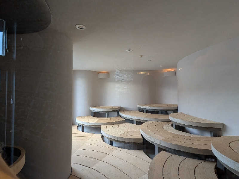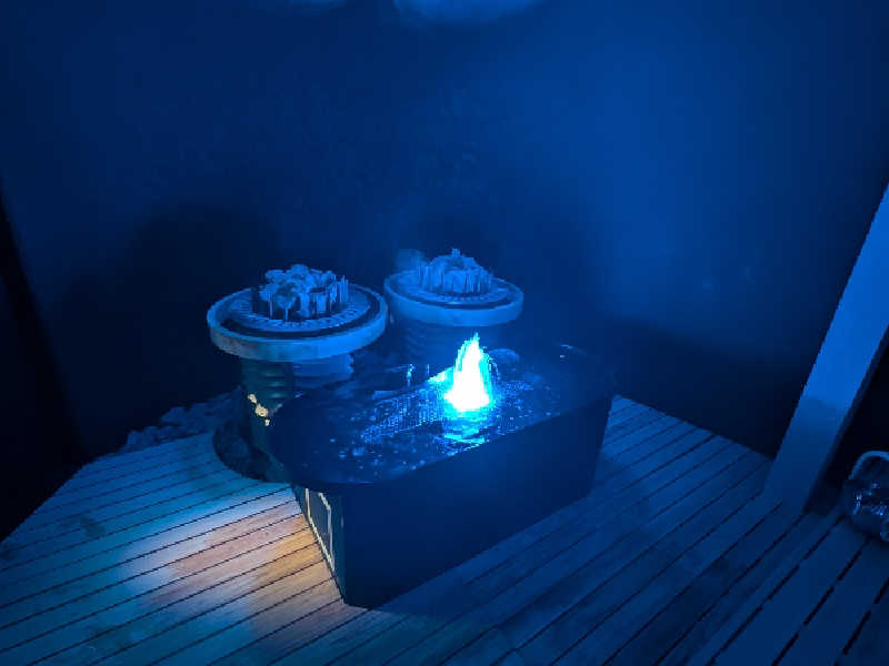 1階に降りて1セット目は鯨サウナ。入って見ると青い光がボヤーっと広がる部屋。一番広いサウナ室。6段くらいでしたかね。3段目ほどに座しキョロキョロ。なるほど、鯨の身体の中を表した作りなのか。正面にはストーブが2つ。そしてその前に噴水プールがずっと噴いている状態。セッティングは程よい感じ。熱すぎない。00分のタイミングで潮吹きタイム。天井まで上がる潮吹き。ストーブ側にも噴いた後は、まさかのサウナーの方にも。しかも2回?3回?めちゃくちゃ熱くなりそう、と思うかもしれませんがそんなことなく、湿度が上がって余計にいい感じに。呼吸もしやすいこと。