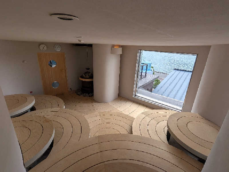 すぐ目に入るのはイカサウナ。ロウリュの時間がすぐだったので、一旦1階へ。そのついでに外で写真もいくつか。どこも映えるところばかりなので、更衣室以外写真撮影OKはありがたい人がたくさんいそう。