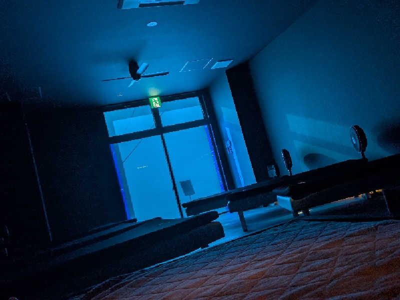【深海ルーム】ムアツマットのベッドx6やウォーターベッドx2が設置されエアコンも効いた究極のサウナ休憩スペース。どこまでも深いリラックスに沈んでいく体験ができる。