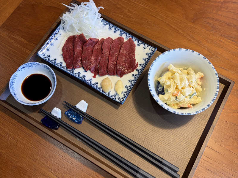 豚丼、生姜焼き、馬刺しどれも美味しくて、サウナ後にちょうどいい満足感