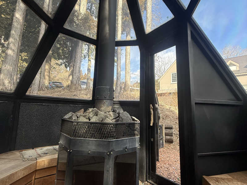 建屋内に入り奥のラウンジで簡単に説明してもらい、遅れて到着の十国峠さんも無事合流。水着とガウン、タオル類を借りてお着替え。支配人の方自らアテンドしていただきながら各サウナとシャワー、不感浴、休憩と順を追って入り身体の内側から温めていきます😆マウンテンサウナで寝サウナからスタート▶️横になることで身体を均一に温めることができるそう。