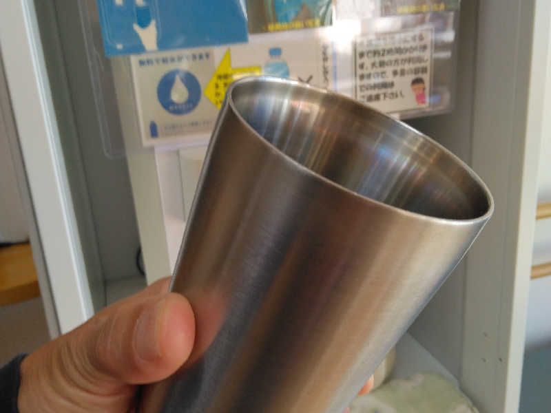 水分補給は「洗面台」直飲みor休憩室の「水マシーン」なのだが、この「水マシーン」利用するには自分のコップ等必要☝自分はハイボールで愛用しているタンブラーにてゴクリ😋