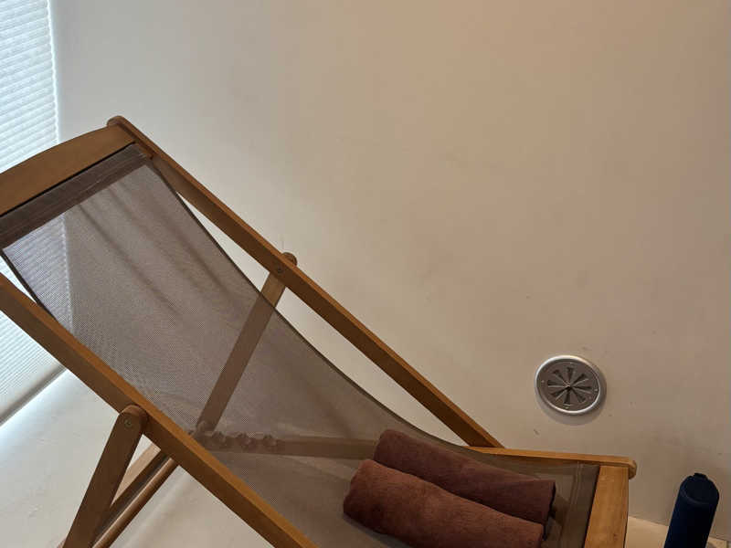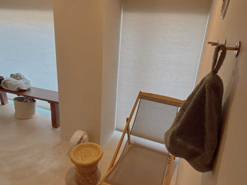 本日は「Day1」の部屋。白を基調としたお部屋。ウッドチェアにベンチ、サウナに持ち込めるスピーカーもある。