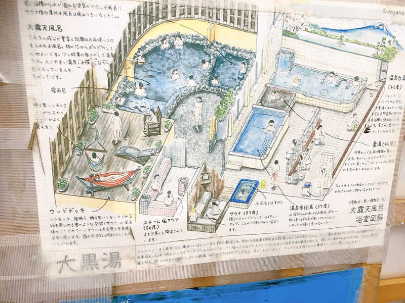 入れ替え頻度:入れ替え頻度:日替わり。 奇数日:男湯 大露天風呂、スチーム塩サウナ / 女湯 炭酸泉。 偶数日:女湯 大露天風呂、スチーム塩サウナ / 男湯 炭酸泉。 ※ドライサウナは双方にアリ。