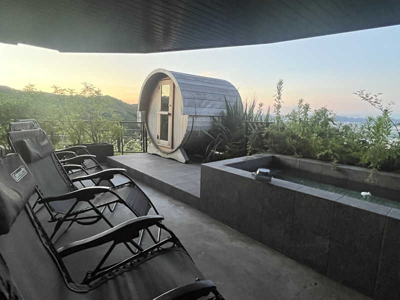 広めのベランダには、水風呂、インフィニティチェアが4つ、そしてバレルサウナが。ここにサウナの全てが集結してる。なんという贅沢さ
