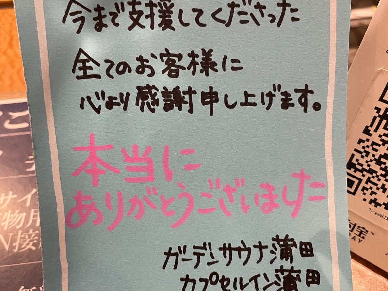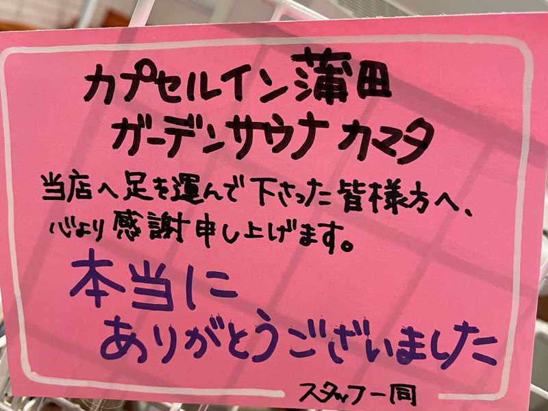 ガーデンサウナ蒲田は自分が本格的にサウナを好きになったキッカケの施設でした。単に気持ち良さを求めて来たり、仕事の疲れを癒しに来たり、色々あって精神的に辛いときに来たりとあらゆる場面で癒していただきました。たくさんの思い出があります。長い間本当に有難う御座いました。