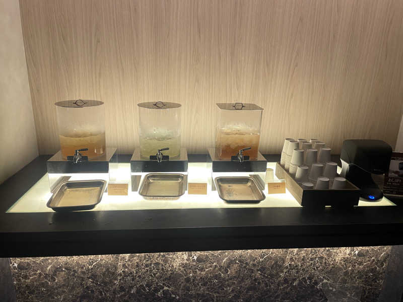 大浴場に入る直前にシャインマスカットのビネガードリンクと温州みかんのビネガードリンクと琵琶茶、あと甘酒がフリードリンクでおいてありました。