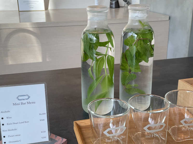 ◆周りに生えているミントハーブを使ったデトックスウォーターが美味しい。オロポ飲み放題もいい。