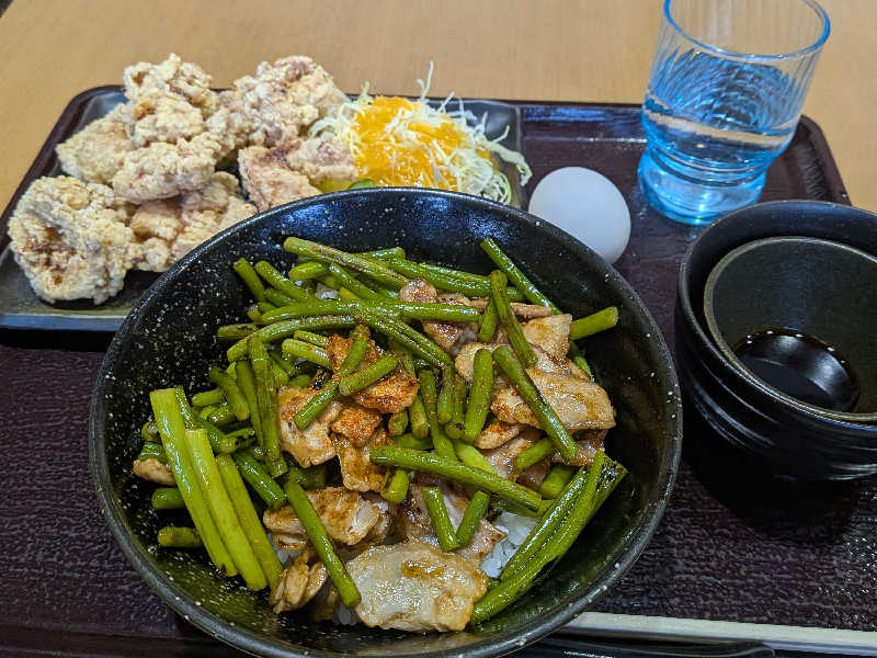 今日のランチは、今月のサ飯ニンニクの芽炒め丼(700円)と唐揚げ単品(590円)を頂きました✨