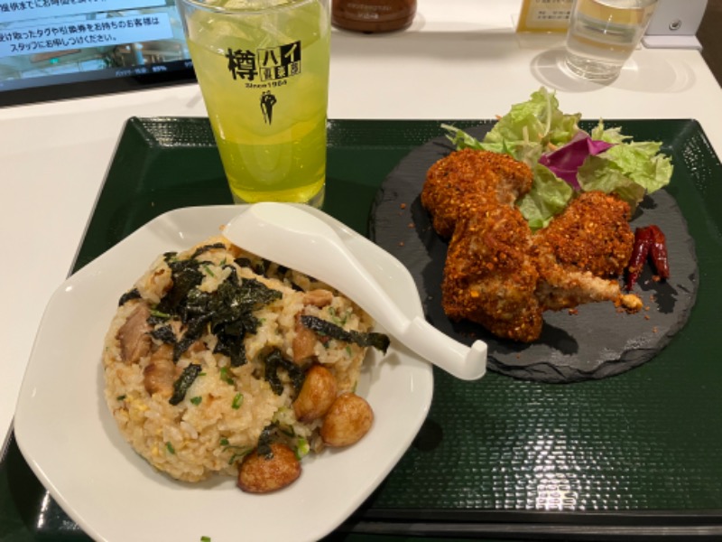 にんにく🧄チャーハンはちょっとベチョってたが、味は良し。スパイシー揚げ鶏は完璧👍