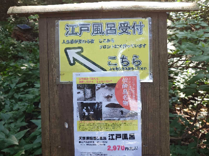 宿の入口でしょうが湯をいただき、つい癖で身を清めたあと、施設のポロシャツ短パンに着替えてから江戸風呂へ。