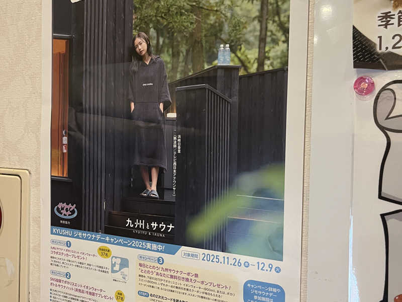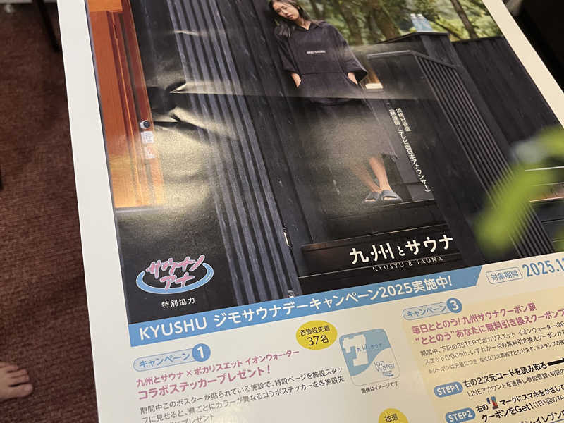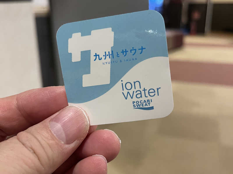 21:30頃にシーサイドスパに入りました。今日から「九州とサウナ」の九州ジモサウナデーがスタート、自分のジモサウナのホームにやってきました。早速イオンウォーターのクーポンとステッカーをいただきました。地元のサウナを盛り上げるこのイベントもすっかり定着してきましたね。いいイベントなのでこれからも続けて欲しいです。