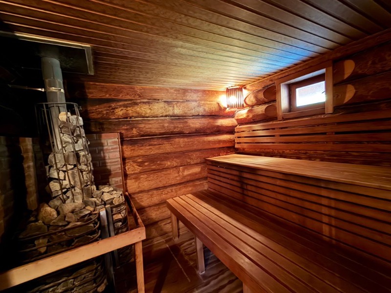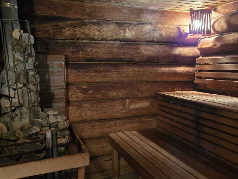 ウィスキング前にまずはログサウナから、扉の彫刻が美しいですね。暗めのサ室には大きいストーブがあり、ベンチもきれいな仕上げでした。丸太の間には詰め物がされていて気密性を高めてバーニャっぽいと思いきや、ロウリュをしてみると蒸気は割と早めに抜ける感じ、熱い刺激の後に引いていくようでフィンランドっぽい、なかなか気持ち良かったです。でもウィスキング向けで比較的温度が低めだったからかも知れませんね。水風呂もキンキンで快晴の空を見ながらの外気浴は爽快でした。