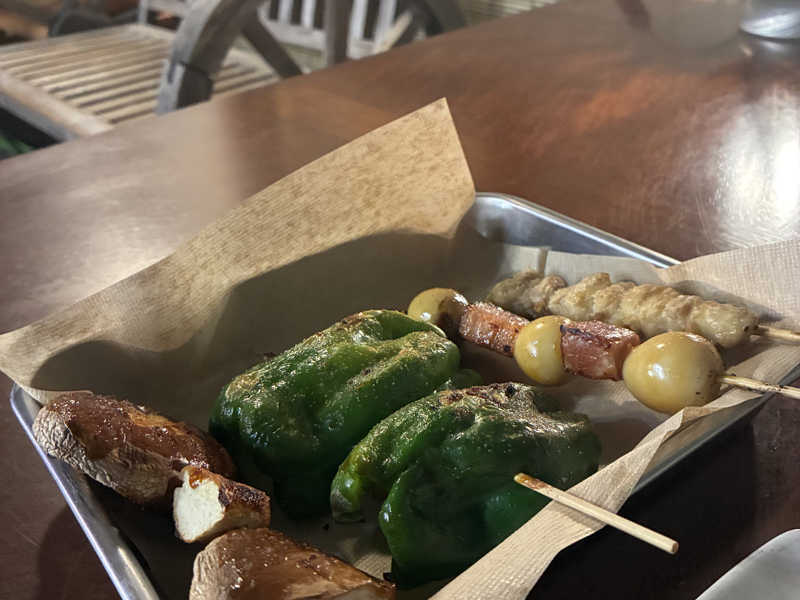 水風呂は体感25〜26℃で、ずっと浸かっていたくなる温度なので、青空と山の緑を眺めながら長めに浸かり、ベンチで昇天。