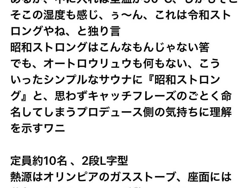 こちらのサウナ入口に昭和ストロングサウナと書いてあるのですが、サ室内は98℃と高温。