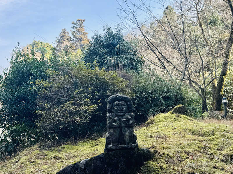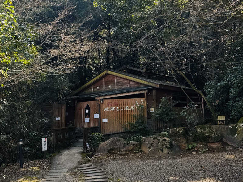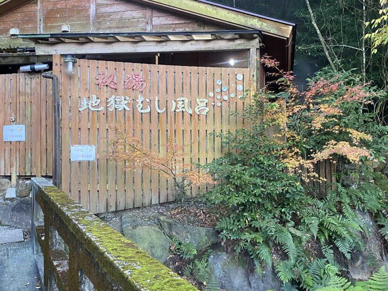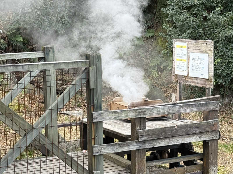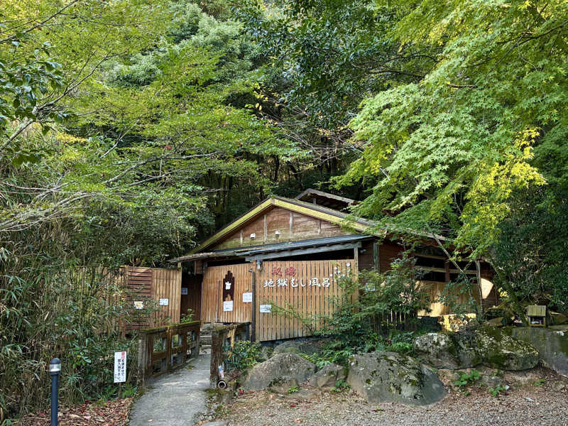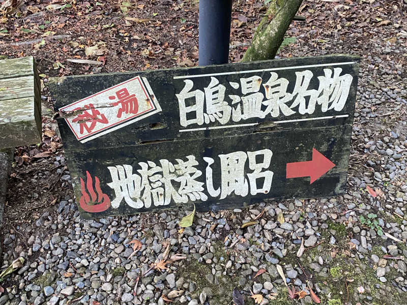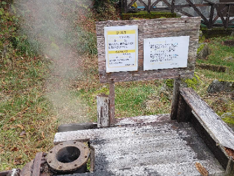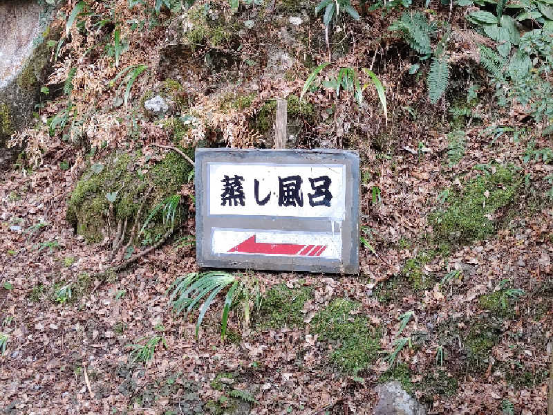 というわけで一通り大浴場を楽しんだが、ここからが本番。一旦体を拭いて適当に服を着て蒸し風呂へ。外へ出て、おっと、なんだこのワクワク感は。昭和な字体で「蒸し風呂←」とな。そして思ったより歩いた先に現れる「秘湯 地獄むし風呂」。秘湯だったのか。そして地獄と呼んでるのか。ちなみにサンダルで歩くが、足元はゴツゴツなので注意。入ってみると、ほぼ屋外という感じの木造建築にカゴタイプの脱衣所。洗面所はないがドライヤーがひとつ。そしてすぐ左に溢れんばかりの水風呂と、...奥の部屋が地獄の蒸し風呂のようだ。水風呂の横ではおそらく温泉と水のマリアージュが体現している。それを桶で浴び、いざ蒸し風呂へ。これは...しっかり熱い。弱めだが硫黄の香り。真っ暗で無音。これが本当に天然の蒸し風呂なのか?最高なコンディションすぎて脳がバグりながら座る。結構広くて10人くらいは座れそう。座面の木は熱いが慣れた。たぶん、今まで行ったスチームサウナの中でコンディションは1番。天然だからか、スチームサウナで若干感じる人工的な匂いもゼロ。こんなスチームサウナが存在したとは。昔の日本にはこういう湯治処がたくさんあったんだろうか。ここは秘湯というだけあってアクセスが良いとは言えないが、死ぬまでにまた来たい。コスパなどという俗世の言葉が似つかわしくないほど至高のクオリティだが、コスパで言っても抜群すぎる。