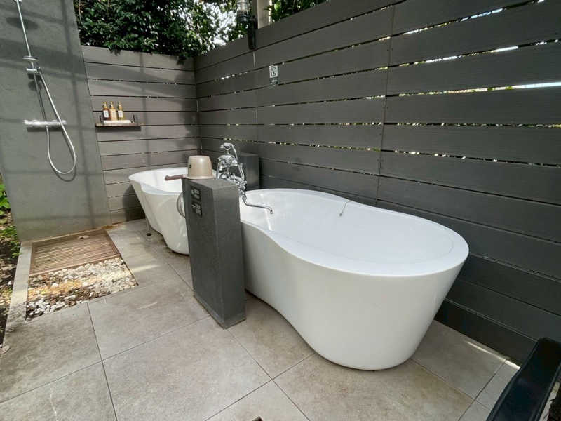 サウナは別荘の庭にあり、壁に汗流し用のシャワーとサウナはモルジュのテントサウナ。1人用の浴槽が2つあり、水とお湯と温泉が蛇口から出る仕様。片方は水風呂、もう片方は温泉と分けた使い方ができます。