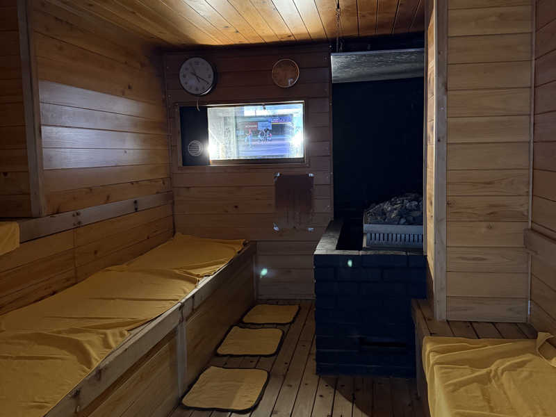 中はシンプル。高温サウナは100度前後でカラカラのストロングスタイル。ストーブに水かけないでとの張り紙も常連さんはタオル絞って湿度だしてる。が、それもおかまいなしのストロング。