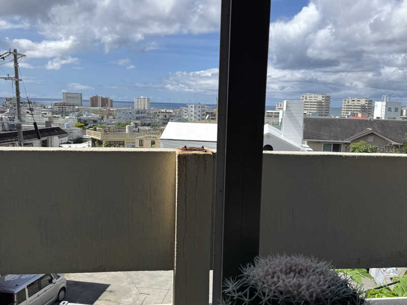 何セットかこなしてから休憩スペースへ。エアコン無しで窓全開。扇風機が複数台稼働して不思議とそこまで暑さは感じません。遠くに宜野湾も見えて中々の見晴らし。