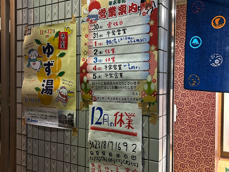 浴場には色とりどりのタイルにギアナ高地(男湯)と奥入瀬渓谷(女湯)をイメージした巨大なタイル絵、瓦や温泉旅館のような石張りの壁。世界観に圧倒されますが何故かおばあちゃん家のような懐かしい雰囲気に包まれます。薬湯や電気風呂、寝湯等、いろいろ楽しめます♪湯船に浸かりながらふと見上げた天井が逆切妻型。ちょうど男湯と女湯の仕切り壁に湯気がぽたりと落ちるようになっているのでは❓だから仕切り壁の上に瓦を乗せてるのかしら❓などと、のんびり湯船を堪能させていただきました😊