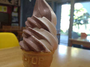 あずき味のソフトクリーム。お店の方オススメのミックスに。あんこだー笑不思議。