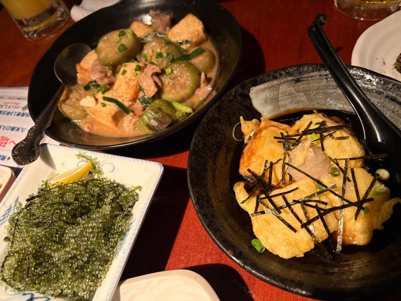 なんて話しながら、ゴーヤチャンプルや海ブドウ、ジーマーミ豆腐、島らっきょうなど沖縄料理を堪能しました