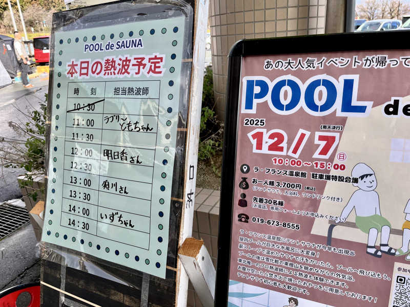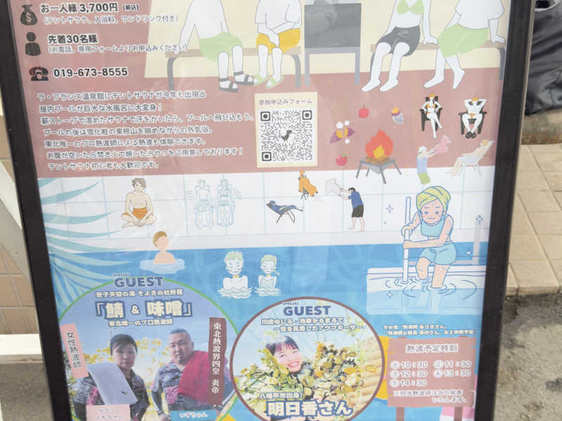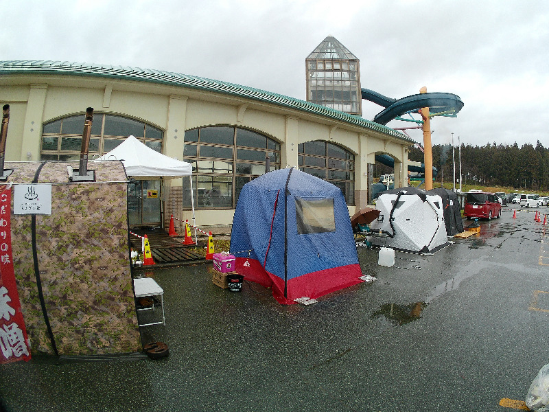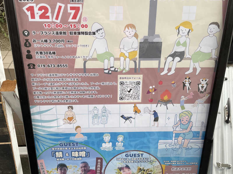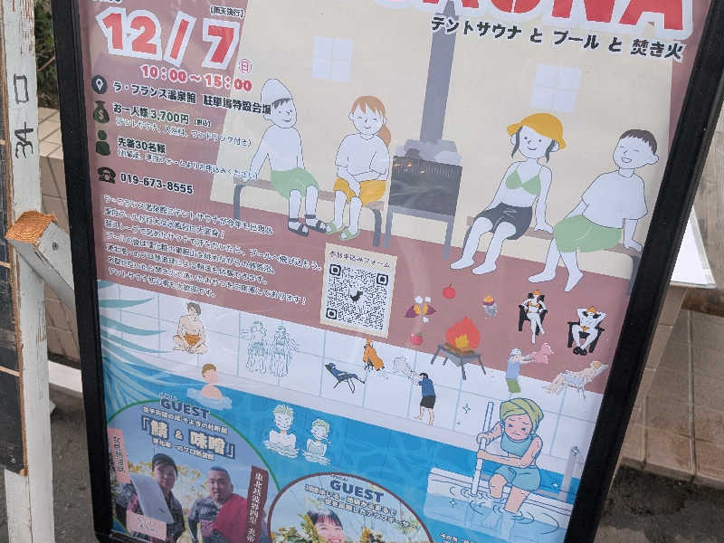 朝方、霧雨けむるなか、志和古稲荷御眷属参拝、幹ふっとく鬱蒼たる杉木立並ぶ参道と、原初感あふれるお社にて今日1日とこの冬の安全を祈念捧げてから、道なりに今日の会場ラ・フランスへとたどり着き、予定のテントサウナイベント参戦でした。玄関手前には、すでにテント4基も並んでいて、昨年よりも明らかに気合がみなぎっていることが伝わってきました。