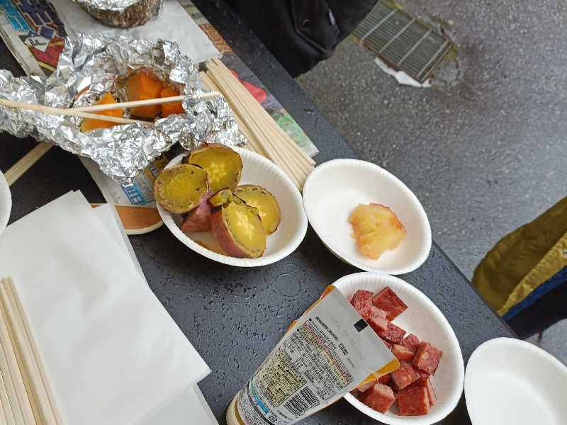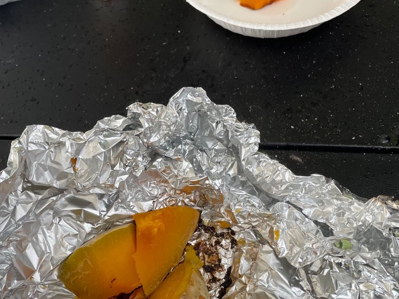おやつとして、焚き火台からこんがり焼き上げられてご提供いただいた、焼き芋、焼きじゃがいも、焼きリンゴ、焼きカボチャ、どれもバターで味付けして塩分補給、素朴にして絶品、旨いので食い過ぎてしまいそうになります。