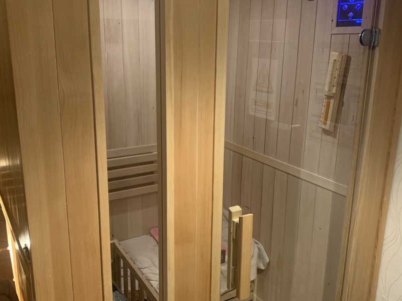 宿泊プランで19時30in!ホテルの方から説明を受けいざサウナ室を見てみたら、、サ道でみたそのまんまのサ室だ。脱衣所までしっかり熱い。温度は85℃ぐらいあってセルフロウリュができる。今回はアロマを2種類もってきてさっそくロウリュすると爽やかなレモンの香りが香りが。まるでアウフグースを受けてるかのようだ。水風呂はサ道の真似を、してコンビニでロックアイスを買い投入、一袋しか入れなかったのでそこまで温度が変わらなかったので試したい方は3個ぐらい入れた方がいいかも?外気浴は窓が一つ開くが窓の位置が高いため風があまり当たらない😭エアコンの風にあたった方が気持ちいい。宿泊者はドリンク一杯と夕食、朝食が一食ずつ、最初にサービスでデザートを貰える。ドリンクはアクリとオロポを注文。夜にサウナ入って、寝て、朝もサウナに入った、やっぱり朝ウナは目が覚めてすっきりとした一日を迎えられる。今日もトトノッタ