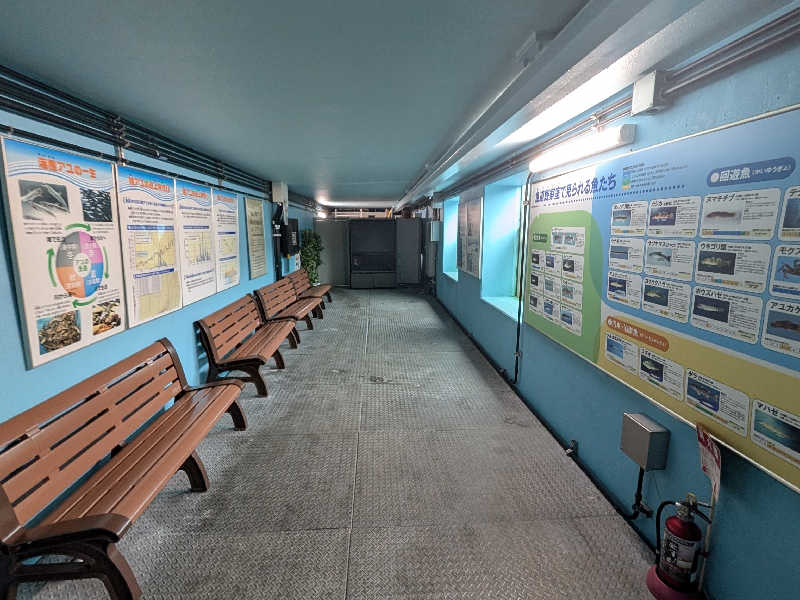 魚道観察室なるものが公開されていて行ってみます。ダムの魚道が横から見れるようになっています。この日は蟹さんが見えただけでしたが、春にはアユの遡上が見れるようです。