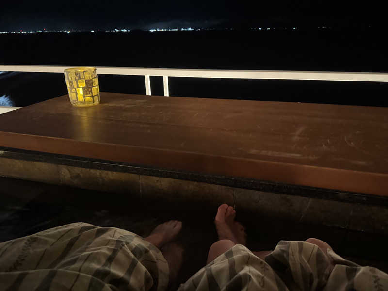 日帰り温泉で利用できる時間帯は11〜15時。洗体して天然温泉の西浦温泉に浸かりサ室へ。ここのサ室は90℃弱なのですが、めちゃめちゃ汗が出ます!!出てすぐ横の水風呂に入る。夏場だから少しぬるく感じます。そのままオーシャンビューの露天へ行き海風が当たるところを探して浴槽のヘリに座る…あー…キモチイイ!