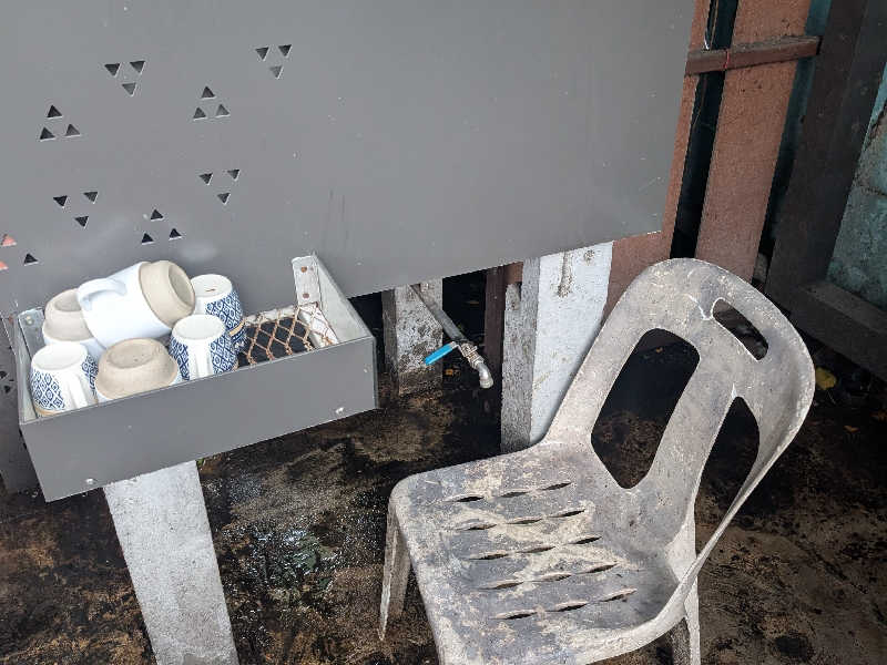 シャワーなどない。サウナ入口にある水の入った甕の水のみ。あとはスコールの雨がシャワーがわり。