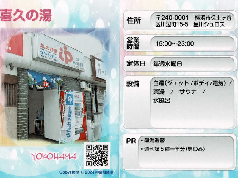 フロントで銭湯探訪のスタンプを頂くと同時に100円で銭湯カードを購入。喜久の湯と上星川浴場。上星川浴場を引くって偶然?