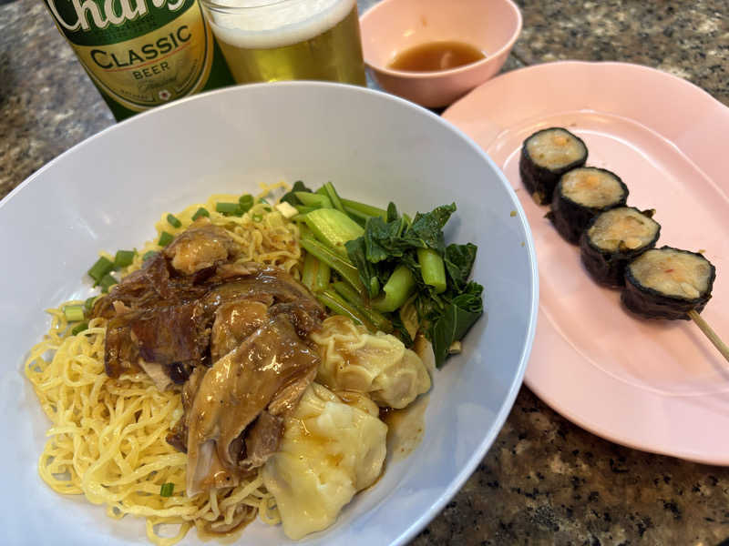 そしてサパーンタクシンのプラチャックでアヒル・ワンタン和え麺。海苔巻のが意外に美味い。アヒル少なっ。