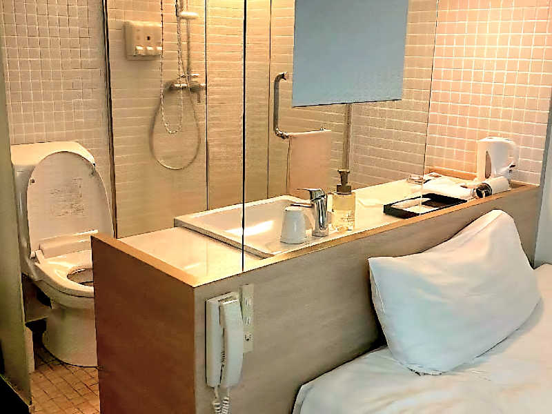 客室のシャワーブースやトイレは部屋から丸見えのスケルトンw